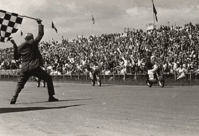 There has only been a 5-year window, when the races weren’t held, between 1940–45, I think you can guess why. Next stop is 1949, when the FIM establishes the World Road Racing Championship, the third race of the season was held in none other than our Cathedral, Nello Pagani winning the 500cc (and the 125cc). From that moment on, every season included Assen. In 1955 the foundation of the illustrious racing line was laid. This new circuit will open to the sidecar enthusiast too. From this point on the number of spectators exploded.